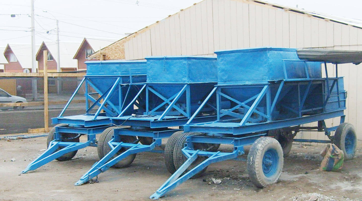 Este práctico vehículo de cuatro ruedas y tiro V está adaptado con dos tolvas de capacidad de carga de 1,5 metros cúbicos. Una de sus ventajas es ser de fácil evacuación del concreto ya que cuenta con dos almejas de descarga independientes que simplifican la faena.